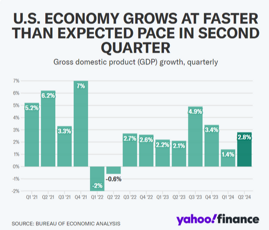 In the second quarter, the US economy grew faster than expected, with a growth rate of 2.8%, surpassing the 2% economists had predicted. This growth was stronger than the revised 1.4% from the first quarter. Investors are watching to see if the Federal Reserve will cut interest rates later this year, as the solid economic performance suggests the Fed has time before making any changes.